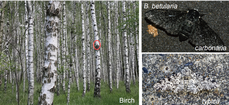 Fig. 1. In habitats of the peppered moth (B. betularia), the pale morph (typica) is well-camouflaged on lichen-covered bark, while the melanic morph (carbonaria) is camouflaged against dark background (e.g., soot-polluted areas). (Photo credit: Silver birch, AJC1, and Ben Sale on Wikimedia Commons CC BY-SA).