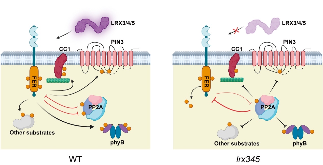 Previous work from Chunzhao Zhao's group at the CAS Center for Excellence in Molecular Plant Sciences revealed that plants lacking either the cell wall glycoproteins LRX3/4/5 or the receptor-like kinase FER exhibit similar stunted growth and salt-sensitive phenotypes, suggesting that they function within a common module coordinating both development and stress adaptation. They further demonstrated that FER balances growth and stress responses by phosphorylating multiple downstream targets. However, key questions remained regarding the specific biochemical interplay between LRX3/4/5 and FER, the regulation of FER kinase activity, and the precise control of substrate phosphorylation.