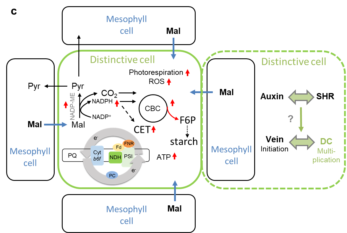 Owing to specialized leaf structures and CO₂ concentration mechanisms, C4 plants have developed a highly efficient photosynthetic system. In the leaves of the typical C4 plant maize, each vascular bundle (vein, V) is surrounded by a layer of chloroplast-rich bundle sheath (BS) cells, with two mesophyll (M) cells separating adjacent vascular bundles, forming a continuously dense pattern of V-BS-M-M-BS-V-BS-M-M-BS-V (Kranz leaf anatomy). In contrast, C3 plants such as rice have multiple mesophyll cells (up to eight or more) between vascular bundles (V-BS-M-M-M-M-M-M-M-M-BS-V). Maize BS cells and M cells contain functionally differentiated chloroplasts and cell-specific metabolic enzymes, enabling each pair of BS and M cells to function as a basic unit for C4 photosynthesis. Therefore, understanding the formation mechanism of C4-type BS cells is considered the cornerstone for constructing the C4 pathway.