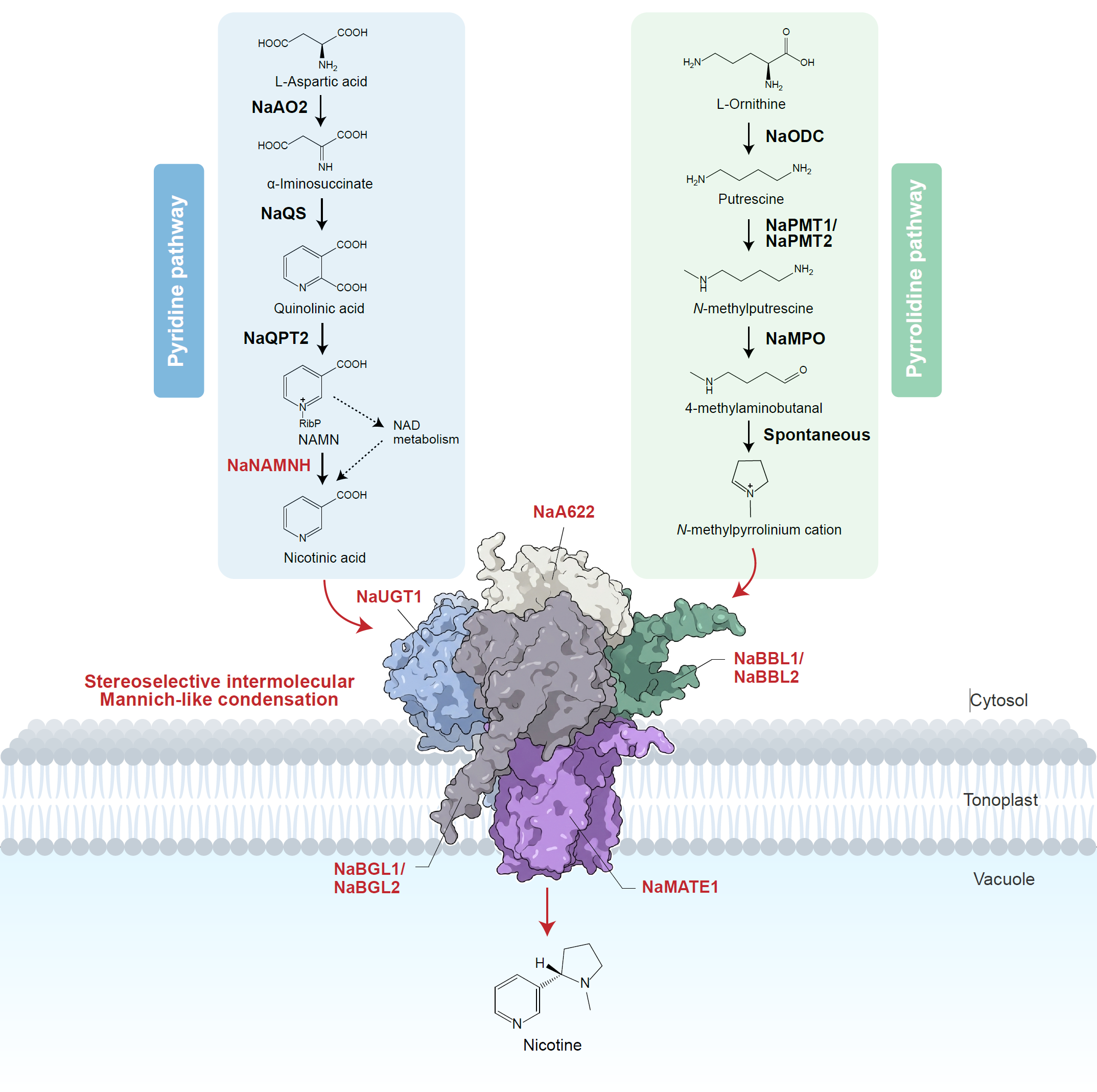 This study completes nicotine biosynthesis, uncovering a multi-enzyme cooperative mechanism that orchestrates a stereoselective intermolecular Mannich-like reaction—a critical “scaffold-forming” step in the biosynthesis of many alkaloids. Many specialized metabolites are cytotoxic and subject to feedback inhibition, posing major bottlenecks for synthetic biology. The evolution of this integrated “biosynthesis-and-transport” metabolon allows nicotine to be efficiently produced and immediately sequestered in the vacuole, effectively neutralizing its toxicity and autoinhibition. This paradigm offers a powerful blueprint for the heterologous production of high-value natural products.