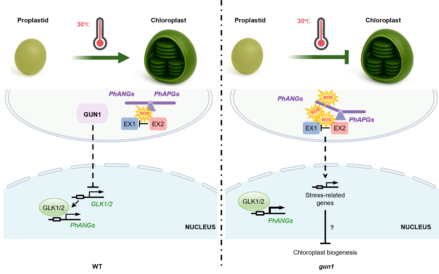 Loss of GUN1 leads to de-repression of GLK1/2, key transcription factors that promote chloroplast biogenesis, even under heat stress. This results in the uncoupled expression of PhANGs in response to heat-stressed plastids, leading to the accumulation of chloroplast-derived ROS, including 1O2, and ultimately the failure of chloroplast biogenesis. The nuclear-encoded chloroplast protein EX1, a 1O2 sensor, detects elevated levels of 1O2 via its C-terminal SOS domain and activates operational retrograde signaling to induce stress-related gene expression. Whether this stress gene upregulation directly inhibits chloroplast biogenesis remains to be determined. Meanwhile, the EX1-like protein EX2 antagonizes EX1, attenuating EX1-mediated 1O2 signaling in gun1.